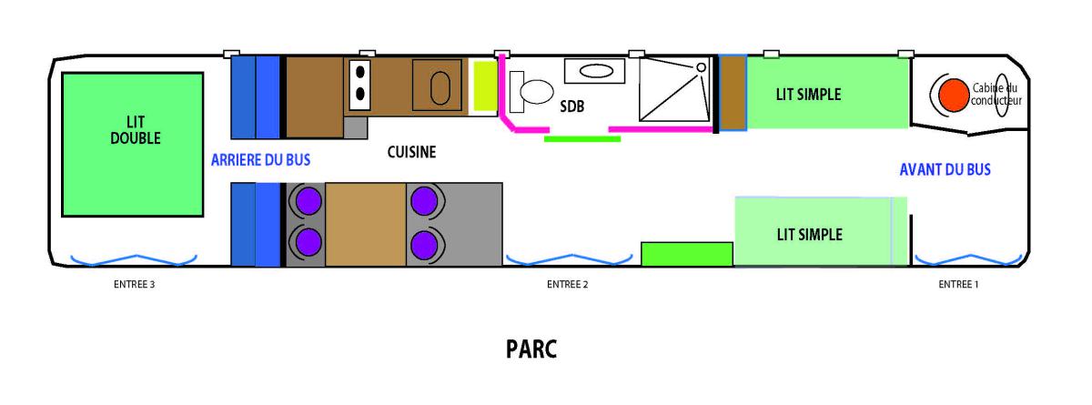 A l’intérieur, vous trouverez une véritable salle de bain avec wc, douche. En espace à l’avant du bus avec 2 lits simples.