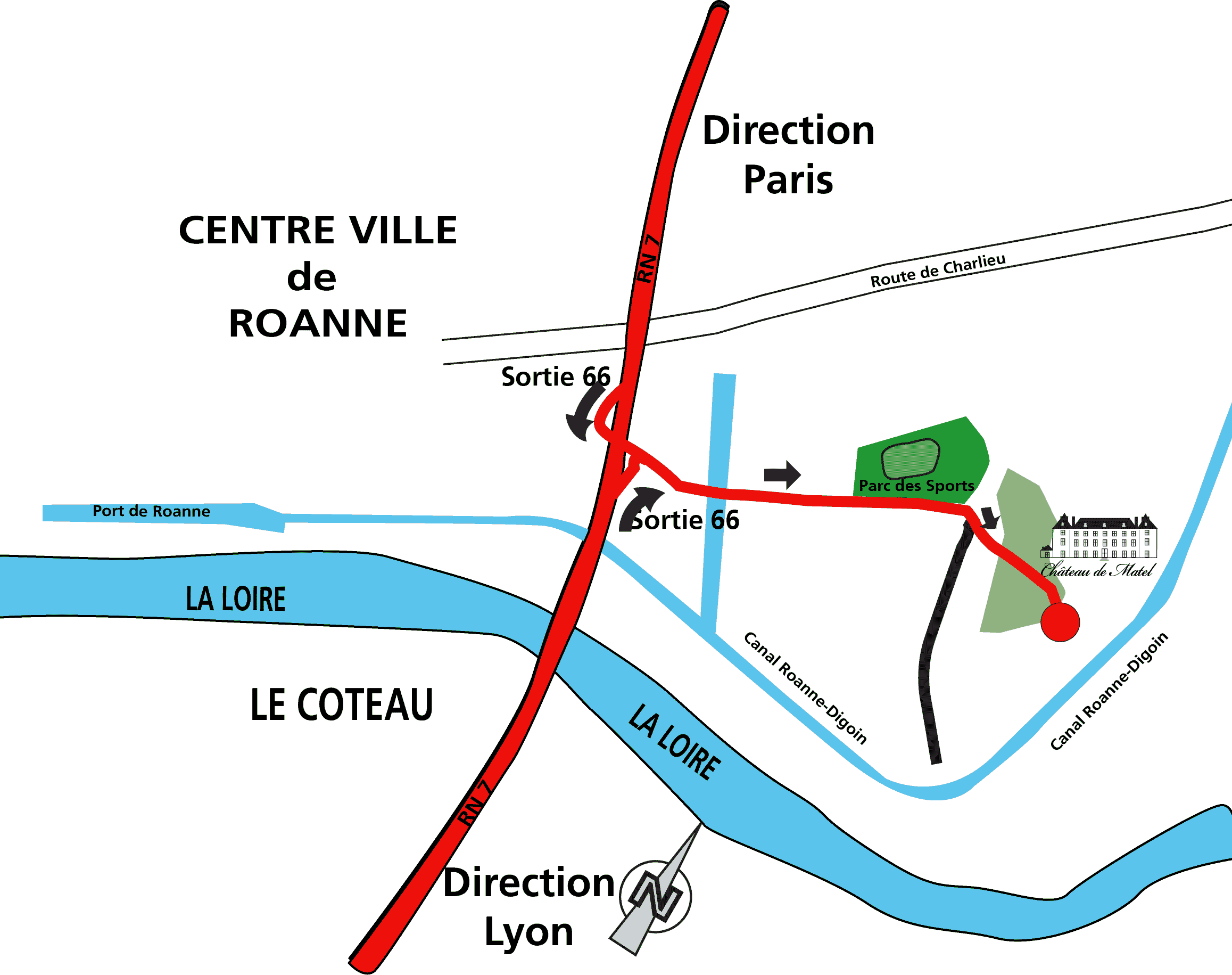 Allez jusqu'à Roanne par la RN7. Une fois à Roanne, prenez la sortie 66 "ROANNE CENTRE/MONTCEAU"